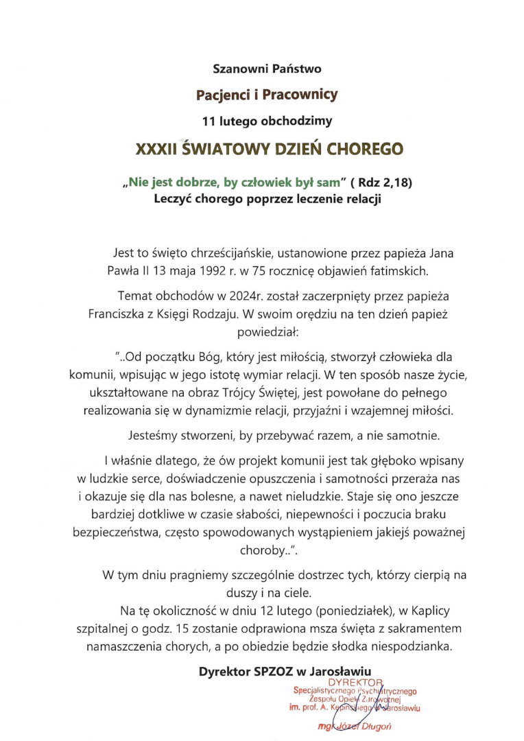 Szanowni Państwo Pacjenci i Pracownicy 11 lutego obchodzimy
